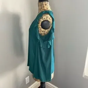Deep green, drapes beautifully, easy to dress up with slacks or slim skirt or down with jeans and boots. Perfect color for the holidays! Rarely worn.
