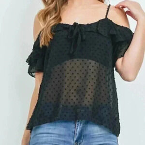 Short sleeve strappy cold shoulder frill tie yoke asymmetric hem textured semi-sheer top.