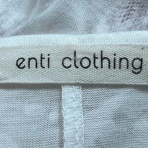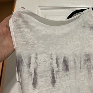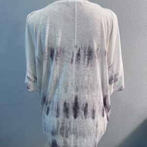 Cold shoulder top. Dolman like sleeves. Slightly fitted at waist but loose. White w/ purples hues. Shoulder to sleeve 13”. Pit to pit 31”. Neck to hem 26”.