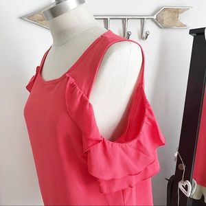 ❤️Bundles 💔Trades ‼️NO LOWBALLING‼️ ⭐️NWOT⭐️ Beautiful Pink cold Shoulder Top with ruffle detail. 97% Polyester and 3% Spandex.