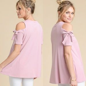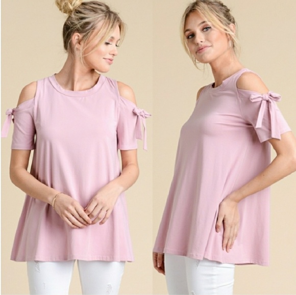 Pink open shoulder top with sleeve tie detail. Super cute and great for summer. 50% Viscose 46% Cotton and 4% Spandex.