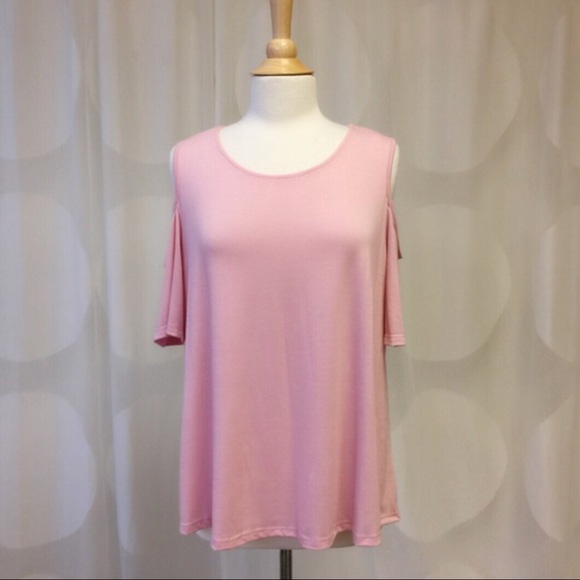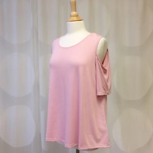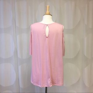 Cold shoulder top. 90% polyester. 10% rayon. Key hole back. Plus size. Pink.