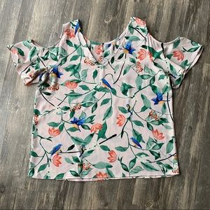 This is a very pretty top with cut out shoulders. The back has a deep v (if you cut out the tag you could probably wear it both ways). It’s a shorter top, armpit to hem 16”