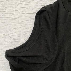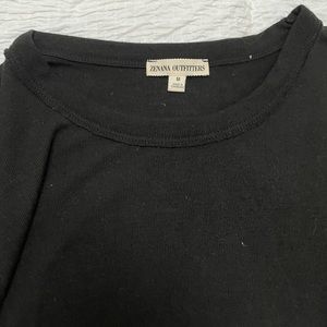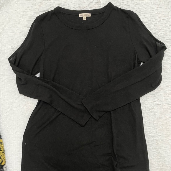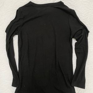 Lightweight sweater like fabric, 76% poly, 19% rayon, 5% spandex. Long sleeves, crew neck, cold shoulder accent. Like new condition.