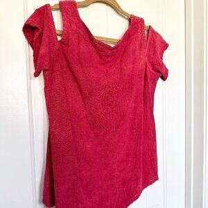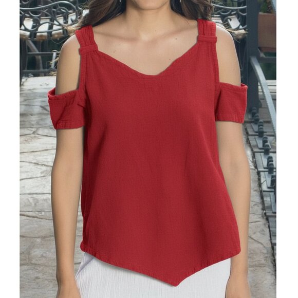 100% Cotton Gauze Cold Shoulder Top. Cotton gauze clothing is known for its comfort, airy texture, breathability, relaxed fit and effortless style, making it a favorite for casual summer outfits.