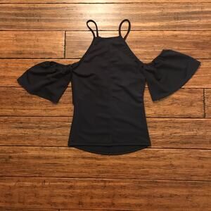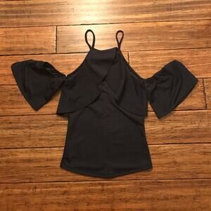 Navy blue ruffle top with cold shoulder detailing. This runs on the small side - please use measurements. 96% polyester, 4% spandex.