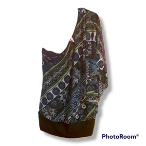 one shoulder, vibrant with blues and lime green in this flowy beautiful blouse. women's size medium
