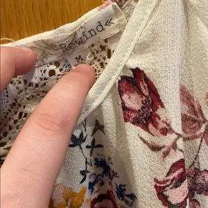 Bundle/set/lot of two Rewind women's cold shoulder tops with thin adjustable straps. Both feature all-over floral prints and a relaxed, flowy silhouette. Lightweight and breezy for warm weather.
