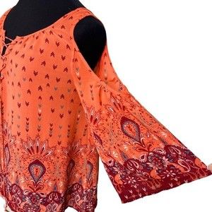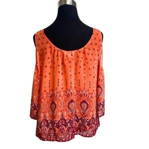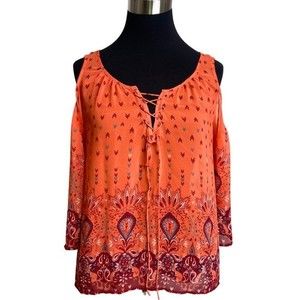 Arizona Jeans Cold shoulder sheer light floaty top size Medium. Women's top by Arizona Jeans company is pretty in orange deep red, turquoise and other colors.