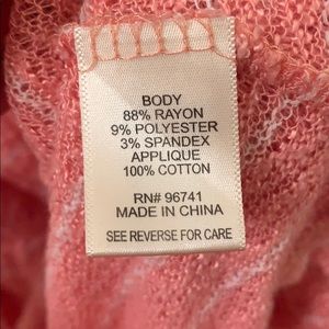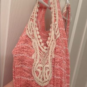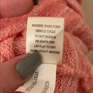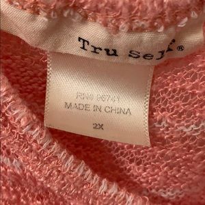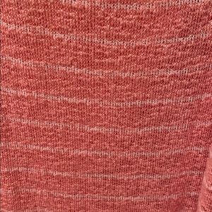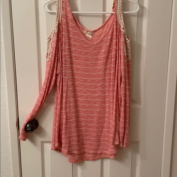 Super soft sweater material. Pink stripe. Lacey detail around the open shoulder.