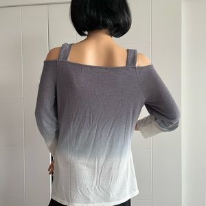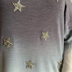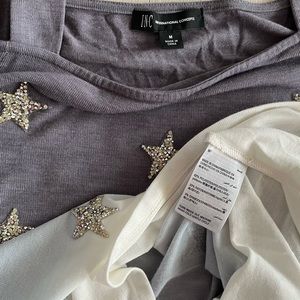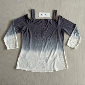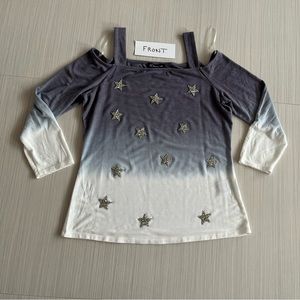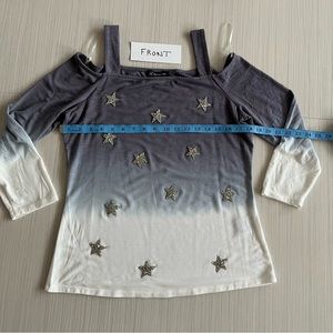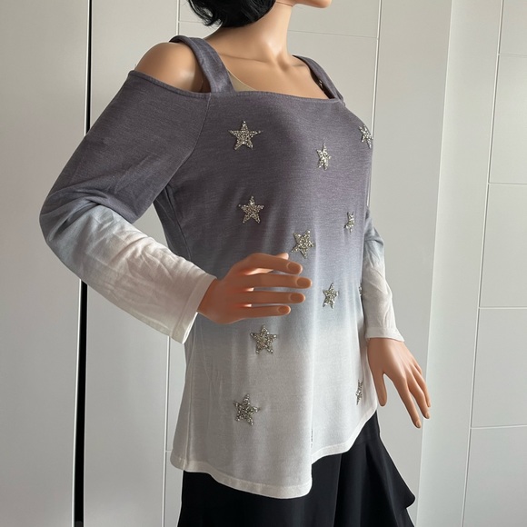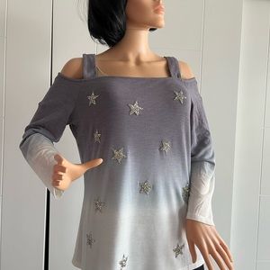INC cold shoulder ombré top with silver beaded star design on front. Bluish grey to white color. Fabric is 62% poly/33% rayon/5% spandex, super soft with slight stretch. Size M measured flat fits up to 38” bust & hips, 34” waist, & is 26” in length. 3/4 sleeves, worn once, excellent used condition.