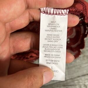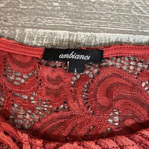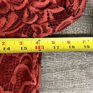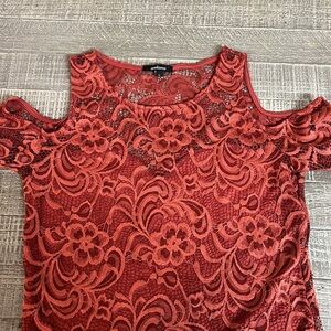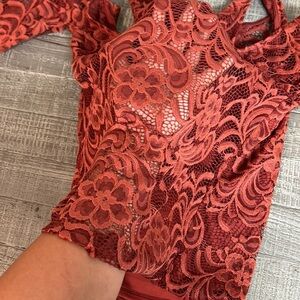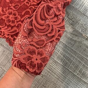 Beautiful lace top in excellent condition Back is open, front is covered by a cami. Color is kind of a rust color T-G