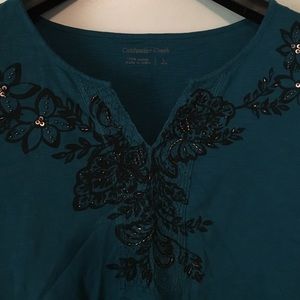 Dark turquoise 3/4 length sleeves, with floral and dreaded real on the neckline. Excellent condition. Large 14/16