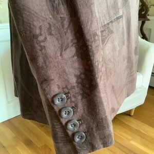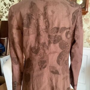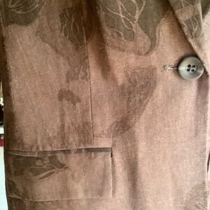 This jacket is in the great used condition. Brown with the flowers pattern. Back slit . Fully lined. Padded shoulders. Length is 26 in, shoulders 16 in, sleeves 24 in. The fabric is linen and rayon blend. Comes from pet free, smoke free home.