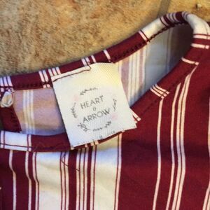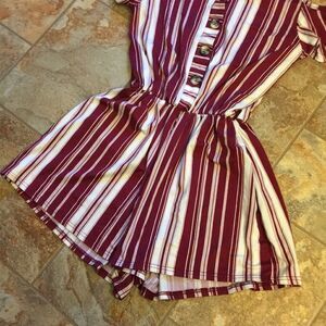 Beautiful and super soft! Wine and white striped romper with faux button front and keyhole back (this is a step-in type romp); elastic waistband.
