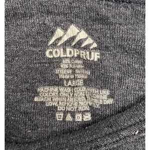 This is a ColdPruf women's long sleeve base layer shirt in size large, made of a polyester and cotton blend fabric. It features a crew neck neckline, pullover closure, lightweight knit fabric, and a solid blue color. Ideal for outdoor activities like golf, fishing, and hiking, this shirt offers warmth and comfort. It is machine washable and designed for regular fit. Top of shoulder to bottom is 25 inches. Shirt is in excellent condition. No tears, stains or snags.
