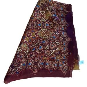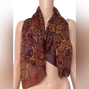 Coldwater Creek 100% silk square scarf. Featuring an elegant paisley and floral pattern in rich tones of burgundy, mustard, blue, and cream, this lightweight scarf is perfect as a head wrap, neck scarf, or handbag accessory.