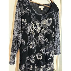 This Coldwater Creek top in size 2X features a Y2K dark floral pattern with sequin accents. The semi-sheer design is made from a cotton blend knit fabric, with a round neck and long sleeves. The top has a unique graphic design, perfect for adding a touch of sparkle to your outfit.