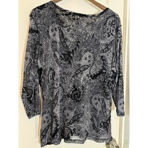 This Coldwater Creek top in size 2X features a Y2K dark floral pattern with sequin accents. The semi-sheer design is made from a cotton blend knit fabric, with a round neck and long sleeves. The top has a unique graphic design, perfect for adding a touch of sparkle to your outfit.