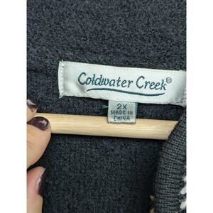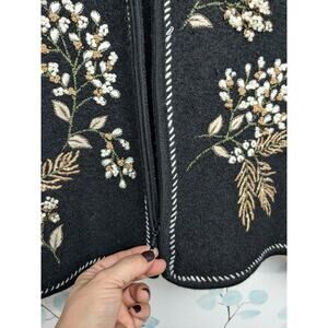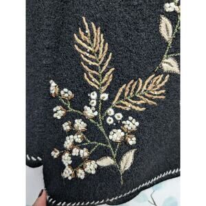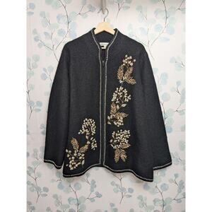 Coldwater Creek 2X Zip Up 100% Wool Cardigan Sweater Black Embroidered Floral