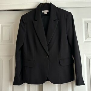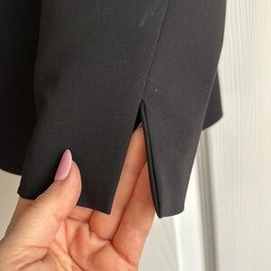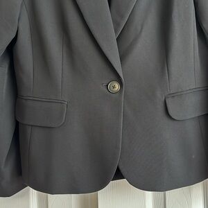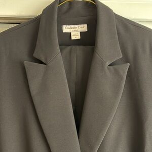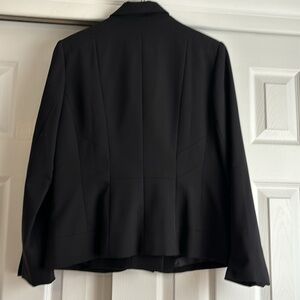 Beautiful like new black cropped pant and classic jacket 2-pc suit from Coldwater Creek. Jacket: notched lapel, front pockets, slit cuff detail, flattering seaming in back. Chest pit to pit 20”, length 25”. Cropped pant has fly front, side pockets, length 25”, waist 16.5”. Poly, rayon, span blend is silky soft. Beautiful suit for business or events. Pet and smokefree home, fast shipping