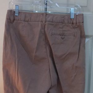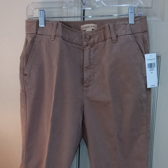 Hidden stretch waist chinos. Hidden side elastic band expands up to 4" at the waist. Mid-rise sits slightly below the waist, straight leg with 14" opening. Softly brushed cotton/spandex twill. Color Luggage.