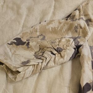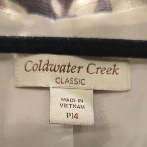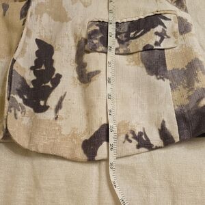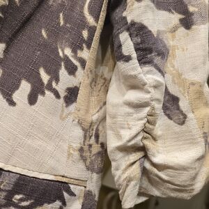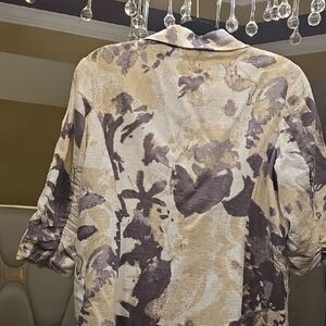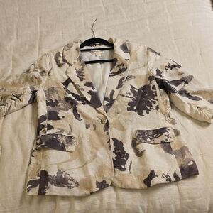 Elegant blazer with abstract floral design. Features rolled sleeves and front pockets.