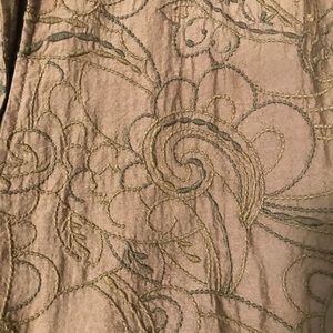 Open front jacket in olive green with beautiful embroidery on both front and back. Lined, no pockets, 3/4 sleeves. Nice over sleeveless dresses or tops. Chest approximately 20” across. Back neck 21” from collar seam to bottom (measured from where collar attaches to jacket back).