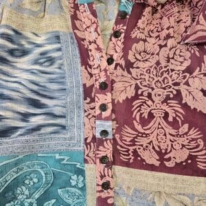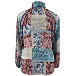 Good used condition, with no stains or tears. A unique patchwork print blouse, with florals and abstract animal prints. Sheer. Has a tie neck with henley buttons.