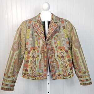 Excellent condition, no holes tears snags or stains, no loose threads. Coldwater Creek fully embroidered jacket/blazer. Hidden front snaps, small slit pockets, split cuffs that can be worn rolled or unrolled. Tans base color with well done, beautiful earth tone embroidery.