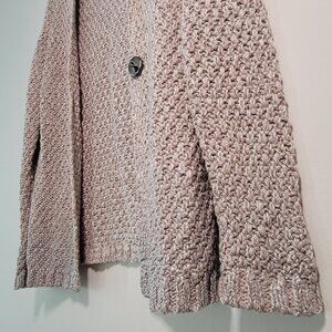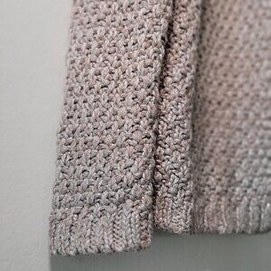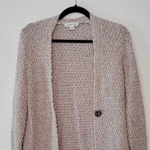 This cardigan is the perfect addition to any fall wardrobe! It is beige with some subtle shimmering at the sleeve cuffs and the bottom hem of the cardigan. This is super cozy and easy to style with anything! In fantastic condition.