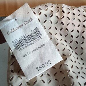 Casual beige perforated hobo bag from Coldwater Creek features one zipper pocket and two open pockets inside plus cute side tassels.