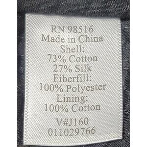 black Channel Quilted black Cotton Silk with Tie Back, notched collar, long cuffed sleeves, front pockets (still sewn shut), lightweight, soft, vented back seam, 2 button closure