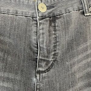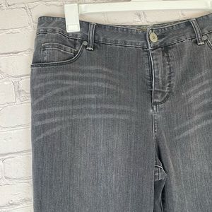 EUC Coldwater Creek brand black with a gray wash jeans size 18 tall. These jeans are a great basic jeans for every day wear. There is some mild whiskering at the front. The back pockets are super cool, brass/gold details on the picker flap with a button closure. The fabric contains elastane for perfect fit.