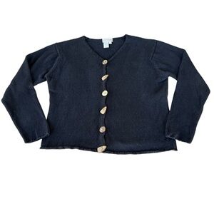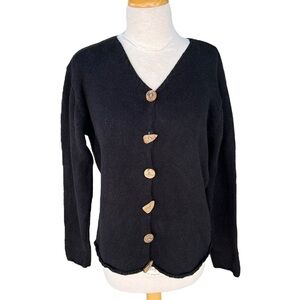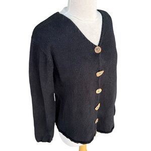 Coldwater Creek Black Knit Cardigan Sweater Boxy Boho Wood Turquoise Buttons Lrg