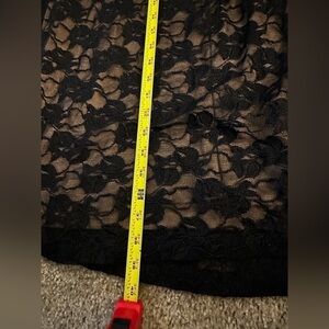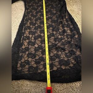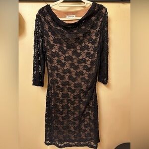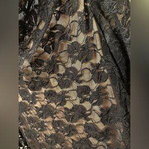 Coldwater Creek women's black and nude lace 3/4 sleeve evening dress in size 12. New without tags. No thread pulls, snags, or stains. Nude lining with lace overlay. Three-quarter length sleeves are sheer without the nude lining underneath. The color is black with shimmer. Hits at about knee length on most.