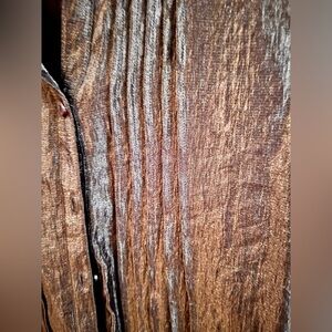 It looks satiny or silky. Buttoned cuffs. Light reflective and tuxedo like stripes.