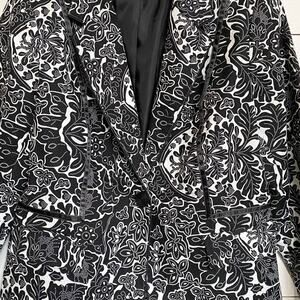 Beautiful black and white blazer from Coldwater Creek. Features wound fabric button and padded shoulders. Beautiful bold floral pattern has texture to it.