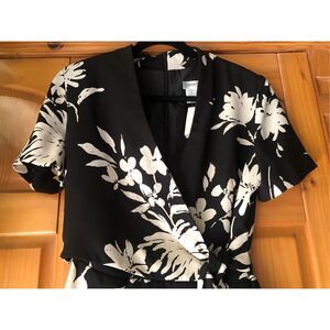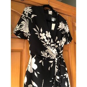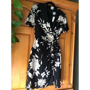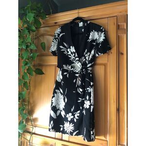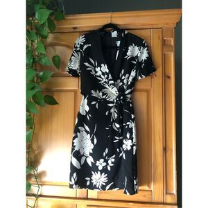 Elegant midi dress with floral pattern. Short sleeves and wrap design. Perfect for any occasion.