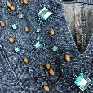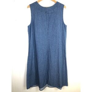 Sleeveless denim midi dress. Embellished neckline. Casual and stylish.