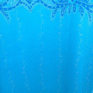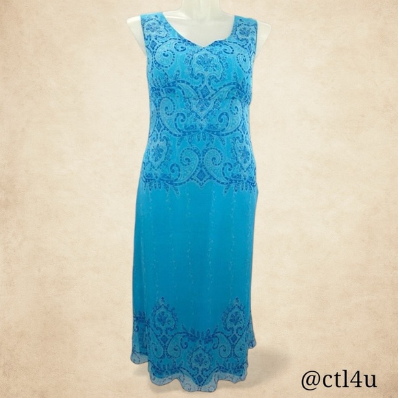 Elegant Coldwater Creek sleeveless midi dress in vibrant shades of blue with an ornate damask paisley motif, accented by delicate vertical white floral vines for a graceful, elongating effect. Tagged size 14 – fits like a Large (Misses), not a plus size. Please check measurements for best fit. Crafted from 100% silk with a smooth acetate lining, this piece drapes beautifully and moves with ease.