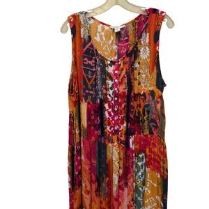 Coldwater Creek sleeveless boho maxi dress in a vibrant multicolor ikat-inspired patchwork print. Made of 100% viscose Style #20927, Made in India, PO# 15000321. This easy on pullover dress features a button closure front bodice, functional side pockets, and long side slits for ease of movement. Perfect for summer and fall — wear on its own in warm weather or pair with a black sweater or jacket when it’s cooler.