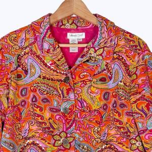 Women's Bright Paisley Floral Print Boho Rainbow Lined Denim Jacket from Coldwater Creek in Pink and Orange. Size Large Petite