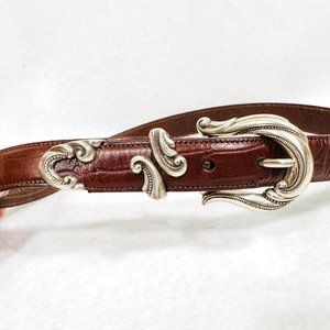 Coldwater Creek brown croc embossed belt. Content is not indicated on the belt as to whether it's leather or faux leather. Fancy silver hardware with a very good finish. The belt shows minimal to no wear. Size small. See measurements below.