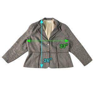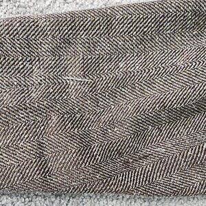 Good used condition, with no stains or tears. A brown and grey herringbone blazer with a 2 button closure. Has gold shimmer threads throughout. Lined, with shoulder pads. Has some light piling.