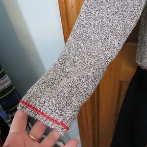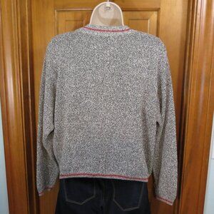 Brown and cream heather threads make up the coloring of this lightweight sweater. Accented with a rusty red stripe on the neckline and hem lines.