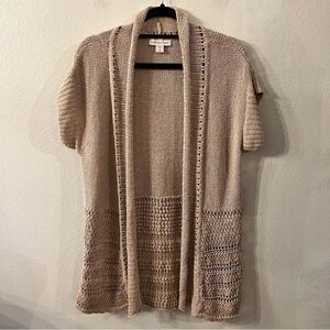 Coldwater Creek Cardigan. Beige. Knit. Open Front. Short Sleeve. Shiny Threads Throughout. Size Medium. Length from shoulder to bottom is 31”. Armpit to armpit is 20”. 55% linen 35% cotton 10% nylon.