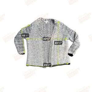 Enveloped in the soft embrace of this Coldwater Creek cardigan, one feels the gentle touch of blended yarns, each strand whispering tales of cozy afternoons. The black and white threads intertwine, creating a harmonious pattern that dances across the fabric, evoking images of serene winter landscapes, promising warmth and style.