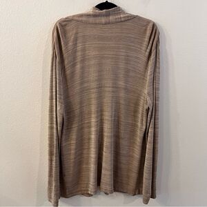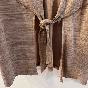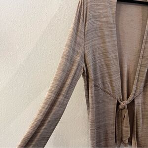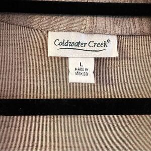 Coldwater Creek Cardigan. Sweater. Travel Knit. Size Large. Tan. Tie Front. 85% acetate 11% nylon 4% spandex. Length from shoulder to bottom is 33”. Armpit to armpit is 22”.