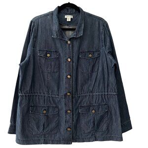 Other: Mock neck; long sleeves; front button closure; pockets on either side; relaxed fit; straight hem